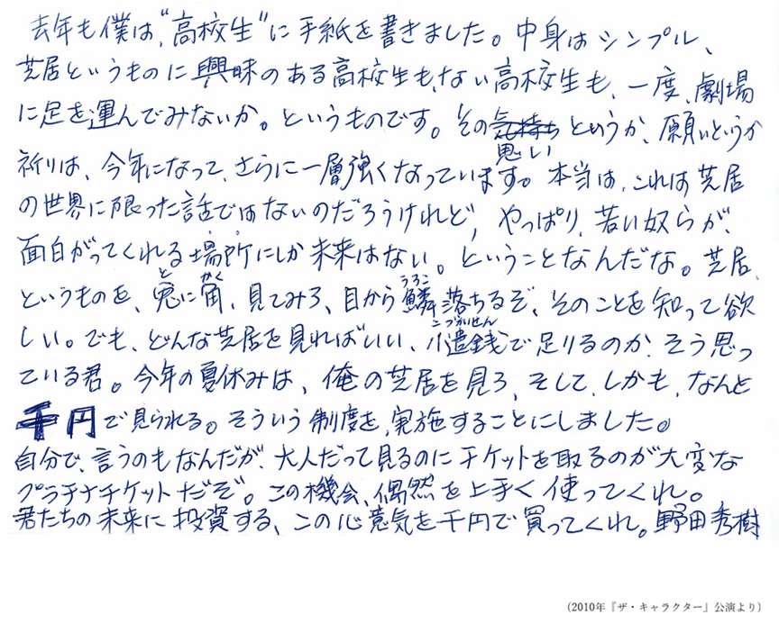 ▽高校生割引の始まり~野田秀樹から高校生の皆さんへ宛てた手紙~▽